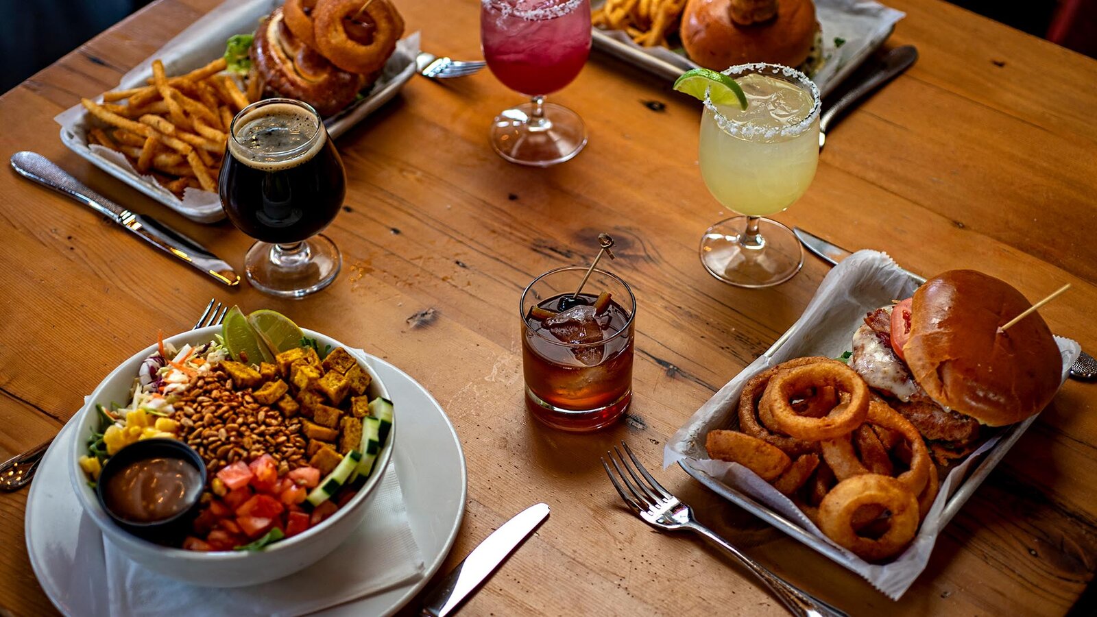 Multiple drinks and plated appetizers