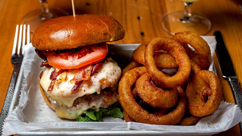 Double bacon cheese burger with side of onion rings